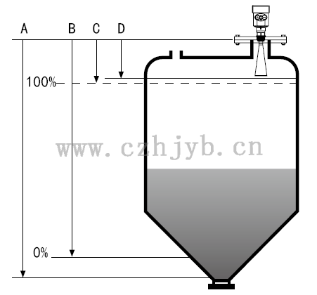 注:使用雷達物位計時,務(wù)必保證最高料位不能進入測量盲區(qū)(圖中D所示區(qū)域)。