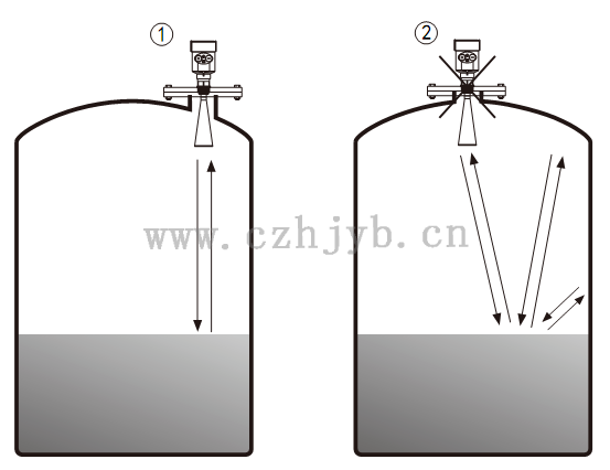 Ø 儀表不能安裝在拱形或圓形罐頂中間。除了會產(chǎn)生間接回波還會受到多次回波的影響。多次回波可能比真正回波的信號閥值還大,因為通過頂部可集中多個回波。所以不能安裝在中心位置。